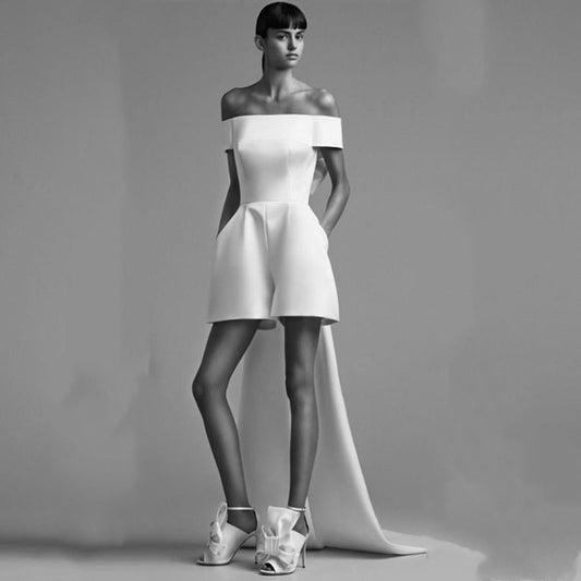 Off the Shoulder Satin Bridal Romper/Jumpsuit with High-low Train