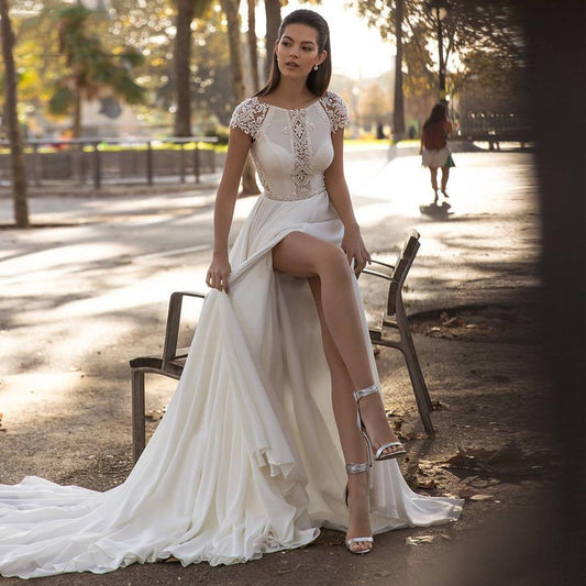 Boho Chiffon Lace Wedding Dress Appliques Cap Sleeves High Slit Bride Dress Backless Vintage Robe Party Gowns Vestidos De Novia