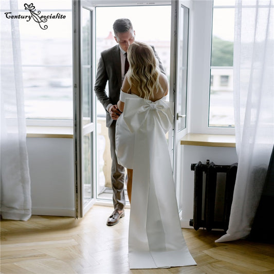 Satin Wedding Dresses Short with Detachable Big Bow Off the Shoulder Simple Bride Dress Beach Bridal Gowns Robe De Mariee 2022