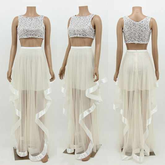 European and American geometric pattern vest irregular party dress mesh long skirt suit